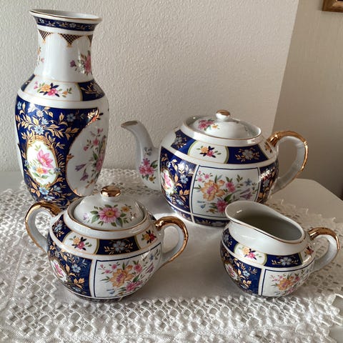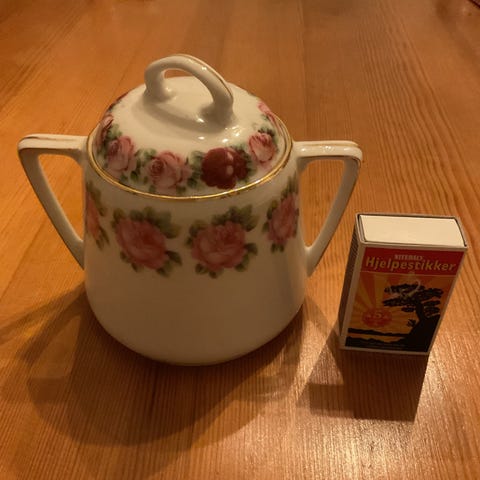 Sett bestående av en liten kremkanne og en rund sukkerskål med lokk. Begge deler er i hvitt porselen med blomstermotiv av roser i rosa og gråtoner, samt en enkel gullkant øverst. Kannen har hank og helletut, mens sukkerskålen har lokk med håndtak.