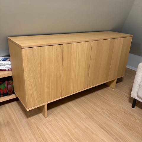Liten tv benk i farge natur, med sjalusi dører. Ingen bruksmerker. Har stått i leilighet uten husdyr eller barn.