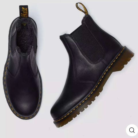 Dr. Martens støvler i størrelse 44. Klassiske snørestøvler i svart skinn med brun detalj bak hælen og karakteristiske gule sømmer langs sålen. Modellen har hemper bak for enklere av- og påkledning og en kraftig, mønstret gummisåle. Egnet som hverdagssko og fritidssko i ulike værforhold. Kjøpte nye fra Eurosko ( litt større for meg) koster 1999 kr.