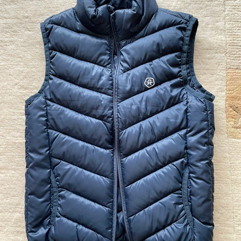 Reima vest for barn i størrelse 146. Vesten er quiltet og har glidelås foran.