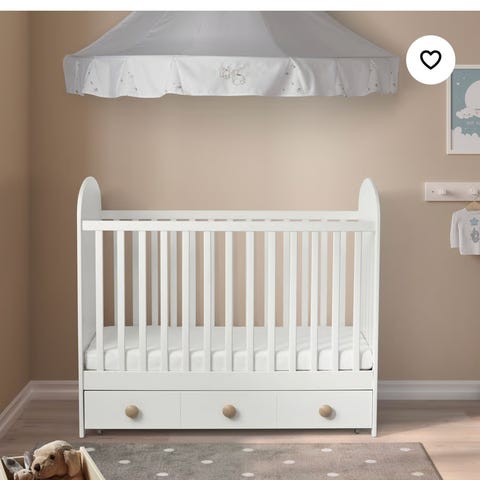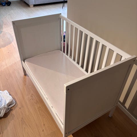 IKEA sprinkelseng i hvit utførelse. Klassisk rektangulær barneseng med sprosser på alle sider. Sengen har plass til standard madrass for sprinkelseng. Passer til små barn/babyer som trenger seng med høye kanter. Madrass følger med sengen. Trekker kan tas av og vaskes.