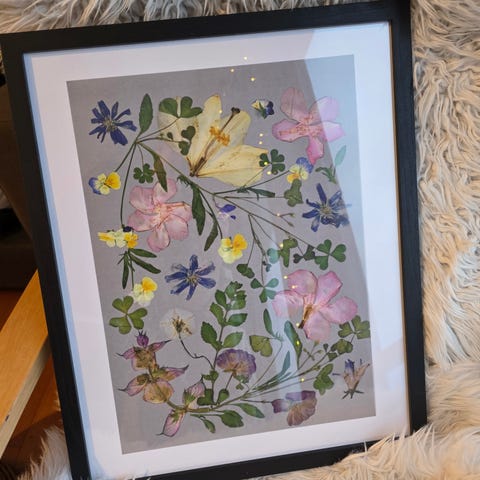 Først skapte og arrangerte jeg denne vakre komposisjonen av ekte, håndpressede blomster. Deretter digitaliserte jeg det ferdige bildet til denne art printen, slik at skjønnheten kan bevares for alltid 🥰.