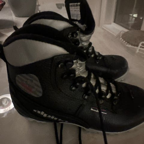 Alpina skisko i mørkeblå skinn med ullfor. Modellen har snøring foran og profilert yttersåle til langrenn. Overdelen er i skinn med tekstilkant øverst i blått, hvitt og rødt. Innvendig er skoene fôret for ekstra varme. Egnet til bruk på langrennsturer i kaldt vær.