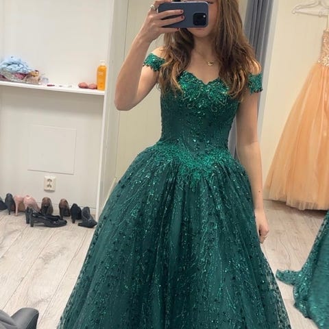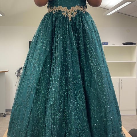 Pent brukt Lychinor ballkjole i grønn og gull til salgs for 6000kr. Kjolen er i str XXS, men passer opp til str S på grunn av snøringen i ryggen. Den er tilpasset i lengden til ei jente på 160 cm. Den er brukt på skoleball og er nyrenset.