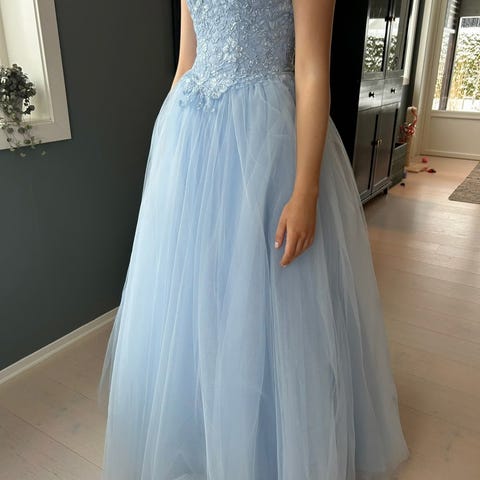 Blå ballkjole fra Tina ritzi, kjolen er Olivia. Størrelsen er Small, men lagt opp og har off-shoulders. Modellen er 158 og 162 med heler. Det er innebygd BH. Glitter og mønster på hele kjolen og snøre bak. Kjolen har et underskjørt på en ring. Pose og underskjørt er inkludert i prisen, vis kjolen blir ødelagt må man betale. Vis du vil prøve kjolen før du kjøper går det helt fint. Ønsker ikke å sende kjolen, og må derfor bli hentet og levert.