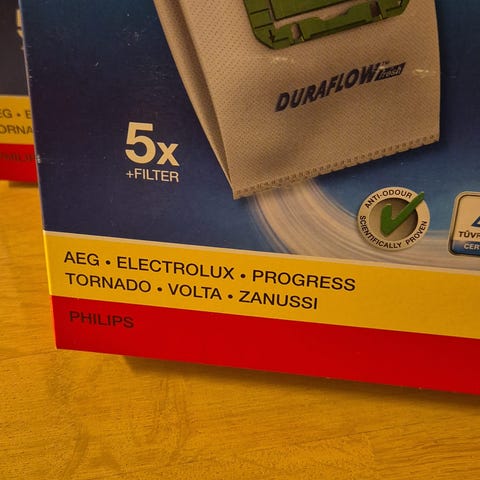 2 av Pakkene er uåpnet og inneholder 5 støvsugerposer med Duraflow-materiale samt filter. Den siste pakken er åpen men inneholder 4 poser.