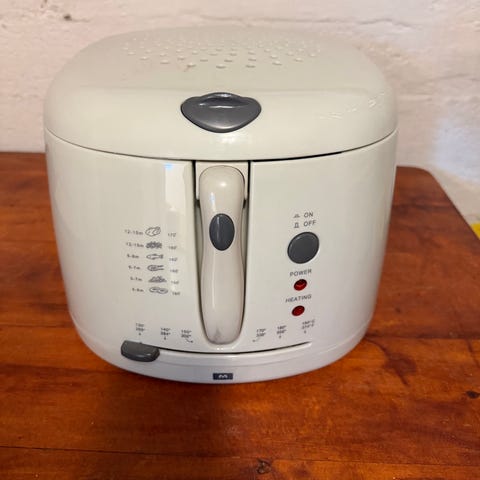 Wilfa frityrkoker i hvit utførelse. Apparatet har indikatorlamper for strøm og temperatur, samt regulerbar termostat med temperaturangivelser for ulike typer mat. Lokket åpnes med knapp på fronten. Egnet til fritering av for eksempel poteter, fisk og annet som tilberedes i frityrkokere. Følger med en metallrist, men håndtaket er noe ødelagt. Apparatet trenger en vask.