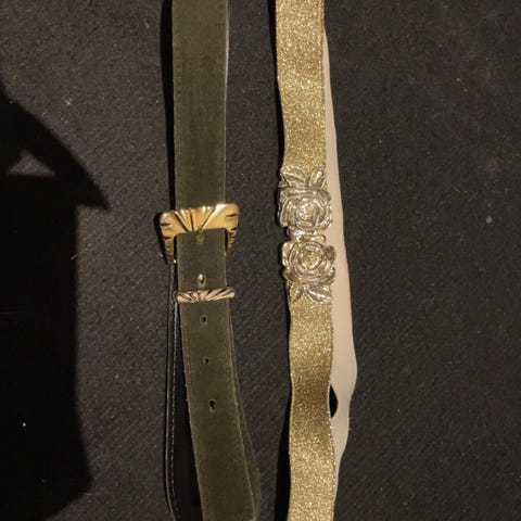 Belte for dame i brun nyanse med dekorativ stoffblomst og bladapplikasjoner foran. Beltebredden er forholdsvis bred, og lengden er målt til rundt 75 cm. Lukkes med knapp bak. Passer som tilbehør til kjoler, skjørt eller tunika for å markere midjen.