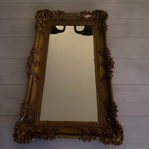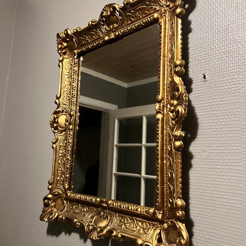 Nydelig gullfarget speil selges. Usikker på hvor gammelt dette er, sannsynligvis fra mellomkrigstiden eller rett etter krigen.