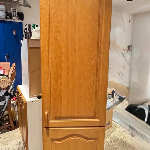 Kjøkkenskap 80cm med eikedører. Skap med doble tredører i lys treutførelse. Skapet har to sidehengslede fronter med profilerte fyllinger og runde knotter i metall. Egner seg for bruk på kjøkken, vaskerom eller som oppbevaringsskap i andre rom.