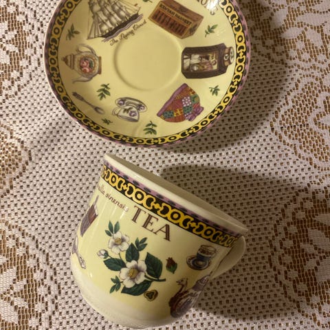 Roy Kirkham Prunus kopp med hank i porselen med kirsebærmotiv. Koppen har hvit bunnfarge med dekor av røde kirsebær, blomster, sommerfugler og grønne blader rundt hele utsiden. Innvendig øverst er det en mindre blomsterdekor. På undersiden er koppen merket med Roy Kirkham Prunus Fine Bone China Made in England. Egnet til varme og kalde drikker.