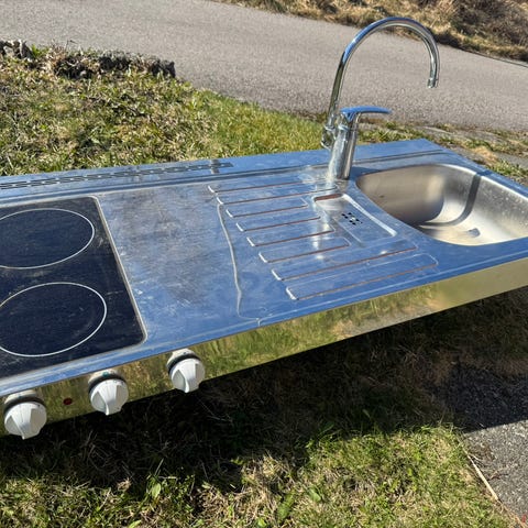 Benkeplaten har utsparing for platetopp. Delen hvor platetoppen tidligere var montert har en sprekk, og denne delen må eventuelt tilpasses eller byttes ut.