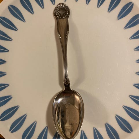 Antikke 6stk små teskje Dobbeltpresset skjell? Mussel Gravert 1916