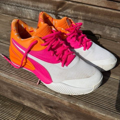 Puma MB.01 basketballsko i størrelse 40 (EUR). Modellen er en mellomhøy basketballsko med snøring. Skoene er i hovedsak hvite med lyse detaljer og grafisk logo på pløsen og hælen. Overdelen består av tekstil og syntetisk materiale, med gummisåle tilpasset innendørs bruk på basketballbane. Egnet som basketballsko eller til hverdagsbruk for personer som bruker størrelse 40.