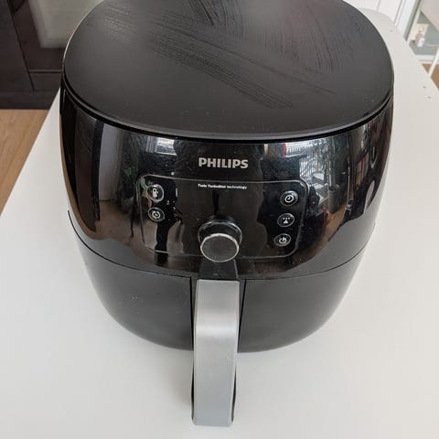 Salter airfryer i svart og sølv med digitalt display på toppen. Modellen har berøringspanel med forhåndsinnstilte programmer for ulike typer mat, samt temperatur- og tidsinnstilling som vises i LED-displayet. Kurven kan tas ut for enkel håndtering av mat og rengjøring. Egnet til tilberedning av blant annet pommes frites, kjøtt, fisk og grønnsaker ved hjelp av varmluft. Ytre overflate har noe slitasje/merker, se bilder for tilstand.