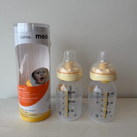 Medela Calma flaskesmokk. Smokkene er utviklet for bruk sammen med Medela tåteflasker og er utformet for å etterligne barnets naturlige sugemønster ved amming. Passer til mating av spedbarn med utpumpet morsmelk fra flaske. Plastmateriale med avtakbart lokk for hygienisk oppbevaring.