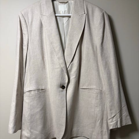 H&M blazer for dame i størrelse M. Jakken er i beige lin og har dobbeltspent lukking med knapper foran. Den har slag, lommer foran og knappdetaljer nederst på ermene. Materialet i lin gir et lett og luftig plagg som passer godt til bruk både til hverdags og mer formelle anledninger.