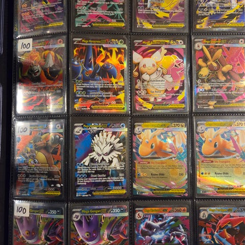 Bildene viser to individuelle EX-kort fra Pokémon Trading Card Game, med for- og bakside. Kortene er plastbeskyttet i sleeves. Motivene inkluderer Gengar EX og Rayquaza EX, samt et bilde av en samling med flere ulike Pokémon-kort i en samlemappe.