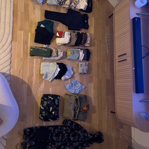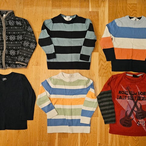 gutteklær pakke i størrelse 98-104, flerfarget. Pakken inneholder ulike plagg som gensere, bukser og sett i forskjellige farger og mønstre, blant annet dinosaurmotiv og ensfargede deler.