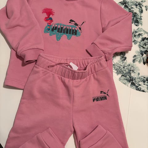 Pent brukt joggedress fra Puma i str. 92. Rosa med gullskrift