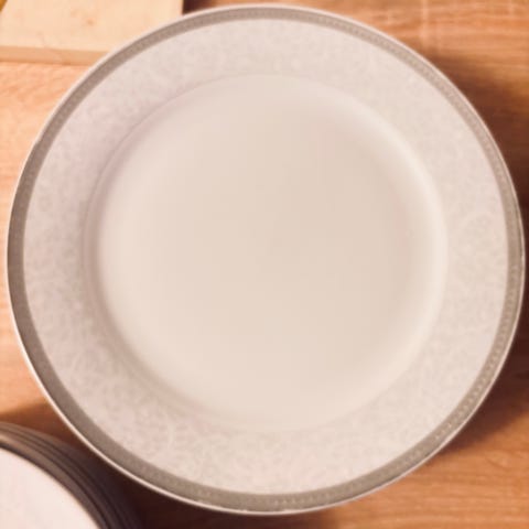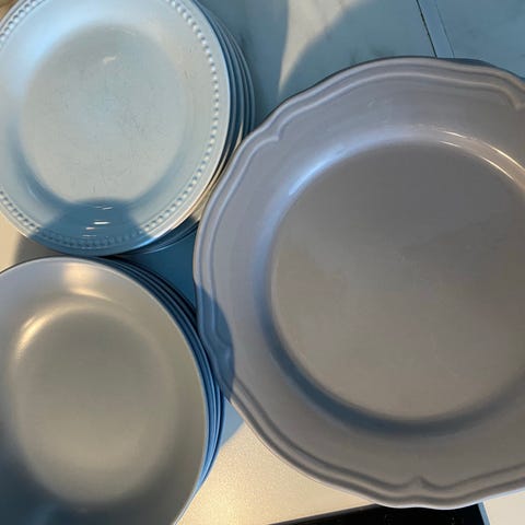 Sett med tallerkener i hvit farge med avrundede hjørner.