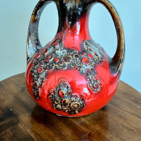 Vintage keramikkvase med "Fat Lava"-glasur i rødt og brunt.