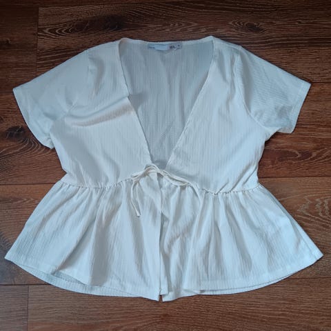 Bik Bok topp for dame i størrelse XS-S. Eggehvit farge. Lite brukt. Modellen har lange ermer, knyting i livet foran og lett struktur i stoffet. Passer som lett overdel til hverdagsbruk eller over andre plagg.