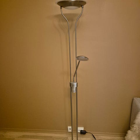 Gulvlampe fra Lampehuset med lydløs led og vendbar topp, slik at den kan brukes som uplight, downlight og alt imellom. På full styrke gir lampen godt arbeidslys til vasking o.a.