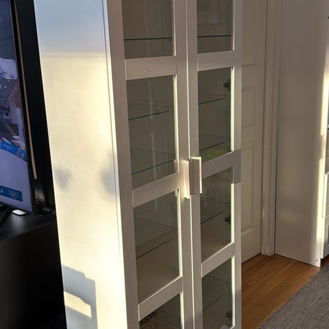 Selger 2 stk OXBERG vitrinedør i hvit/glass. Første bildet viser hvor fint det kan bli i en utstyllingshylle med de dørene. Andre bilde fra IKEA