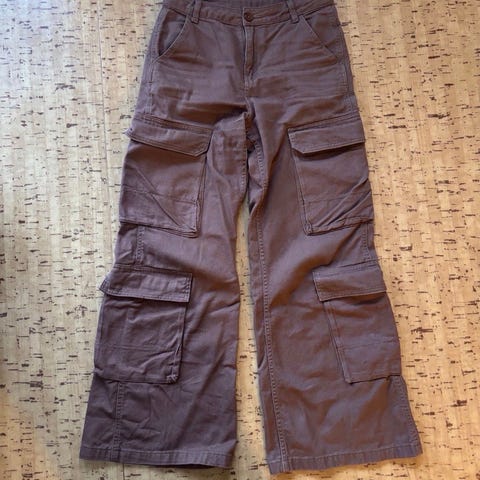 H&M grå cargo bukse for dame i str 34/ Modellen har flere lommer, inkludert cargolommer på sidene av bena. Passer som hverdagsbukse eller til fritidsbruk. Materialet er lett og mykt, og buksen har beltehemper i livet samt knapp og glidelås foran.
