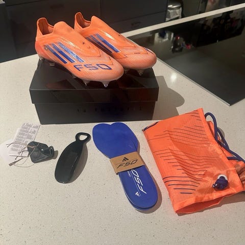 Adidas F50 Elite Laceless SG fotballsko i oransje med blå detaljer. Modellen er uten lisser og har skruknottesåle (Soft Ground) til bruk på myke naturgressbaner.Feilbestilt. Bestilte med trykk så ikke mulig å returnere. Har førsøkt å fjerne trykk, men har ikke fått vekk alt.