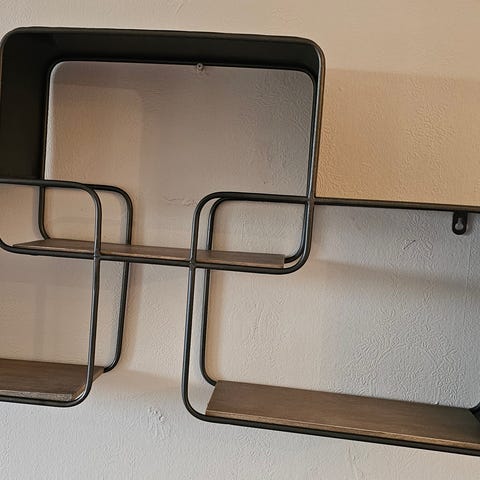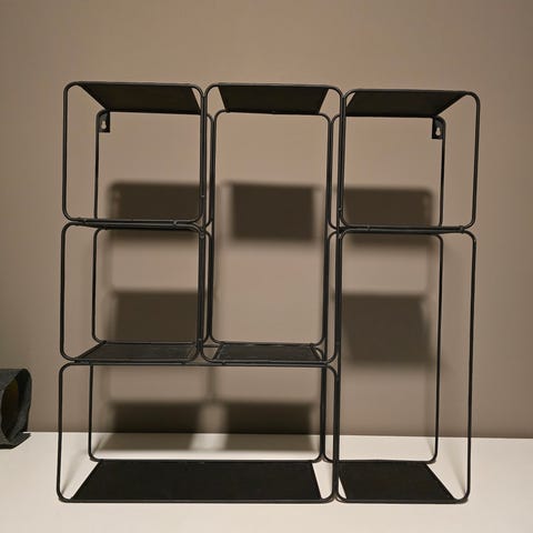 Pen stor hylle med flere hyller i forskjellige høyder. Den er i metall i svart farge. Nypris 2499kr.
