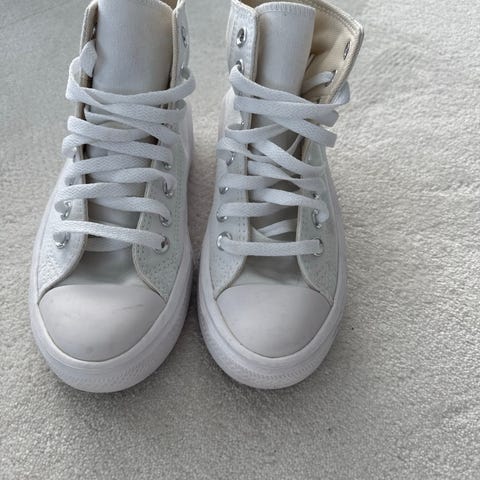 Converse sneakers i størrelse 37 og 37,5. Pakken inneholder tre par sko i ulike farger: ett par røde høye sneakers i tekstil, ett par blå høye sneakers i tekstil og ett par hvite lave sneakers. Alle par har snøring foran og gummisåle. Passer til hverdagsbruk og fritidsaktiviteter.