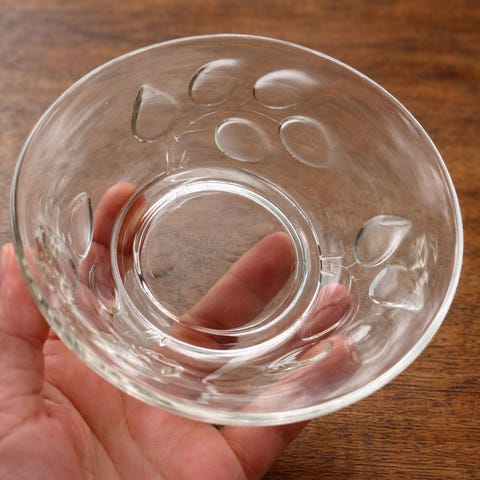 Firkantet skål bolle, og to runde dessertskåler. Alt er i flott stand, så godt som ingen bruksspor. Dessertskålene har en bitteliten boble hver fra produksjonen, ganske vanlig i eldre pressglass. Disse er de originale dessertskålene. Design Willy Johansson.