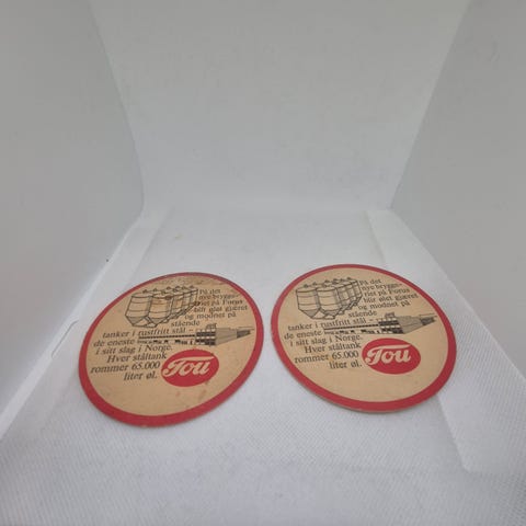 Tou ølbrikke. Motivet viser bryggeritanker og tekst om bryggeriet på