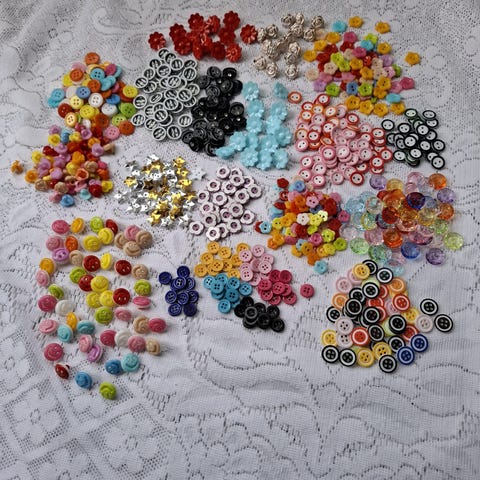 Pakke med assorterte knapper og spenner i ulike farger, fasonger og størrelser. Inneholder både små og store knapper, noen dekorative knapper, mange med barnemotiv, D-ringer, øyne etc. Leveres sortert i små plastposer og rør. Alt selges samlet og har en mye høyere verdi solgt løst. Ca 1,6 kg.
