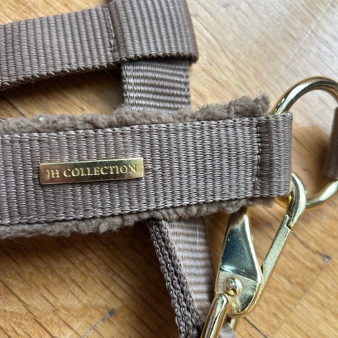 Grime til pony i blått tekstilmateriale med justerbare reimer og metallspenner. Nesereim og nakkereim er fôret med mykt, lys kunstpels for økt komfort. Medfølgende blått flettet leietau med karabinkrok i metall. Egnet til daglig håndtering og leie av ponni.
