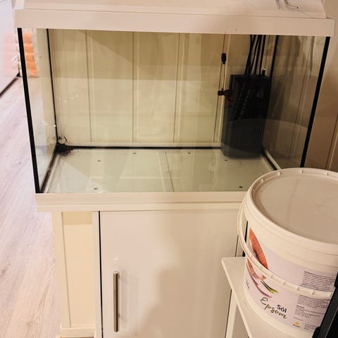 Fint lite akvarium på 19l, brukt som terrarium/vivarium til insekter. Glasslokk og plastramme følger med, ellers ikke noe annet utstyr.