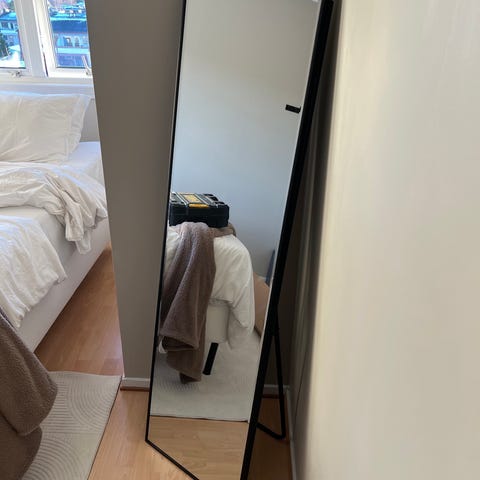 IKEA speil med svart ramme. Frittstående speil som kan plasseres på gulv inntil vegg. Rektangulær form med smal, mørk ramme