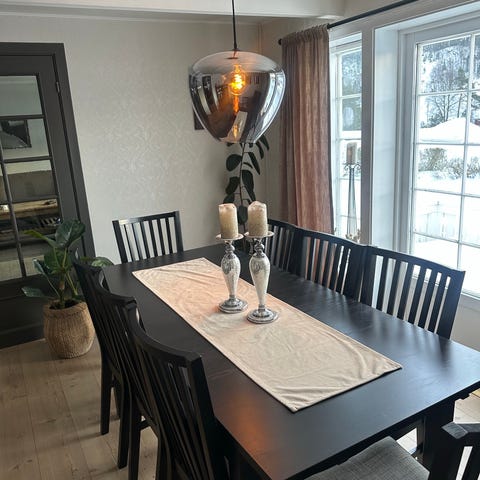 Fin spisestue med 2 ekstra plater som gir bordet mulighet til å ha 10 personer + en på hver ende om det er ønskelig. Totalt 12. Platene ligger skjult under bordplaten på hver side av bordet. De festes på hver ende av bordet på en skinne man trekker ut.