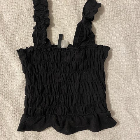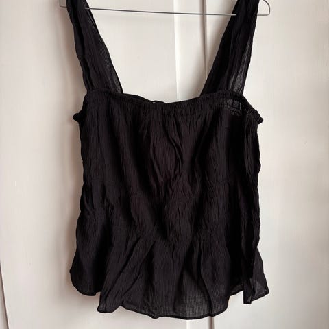 Gina Tricot topp for dame i størrelse XS. Toppen er svart og laget av bomull. Den har brede, rynkede stropper og rynket stoff over hele plagget.