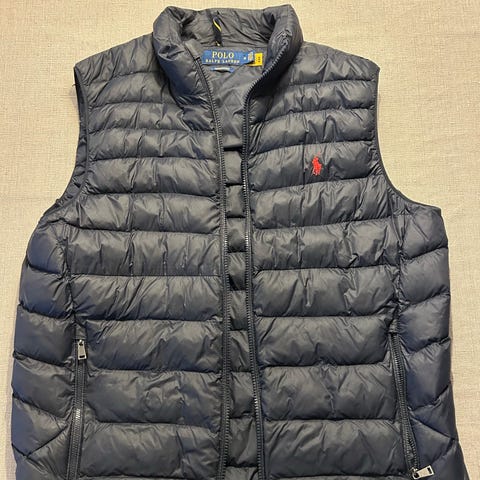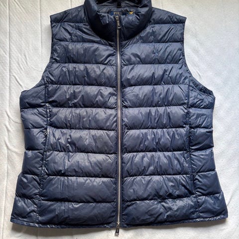 Polo Ralph Lauren Newport dunvest i mørk blå farge til herre. Vesten har glidelåslommer og brystlomme med glidelås. Den er pent brukt, og har ingen synlige merker eller skader. Jeg satte den derfor på «som ny». Størrelse Large gutt 14-16, tilsvarer XS i voksen. Dette er den versjonen av vest med mye dun, ikke den tynne. Ny-pris 2.700,-.