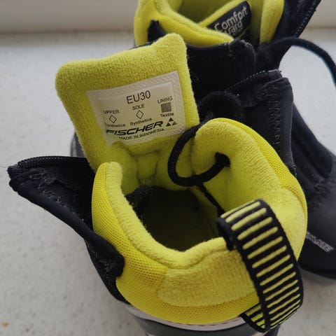 Fischer langrennsko for barn i størrelse EU33. Skoene har glidelåslukking foran og innvendig fôr i gul tekstil. I tillegg følger det med et par klassiske langrennski og et par staver i barne-/juniorstørrelse. Utstyrspakken passer til barn som skal gå langrenn på tur eller i løype.