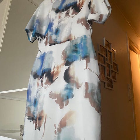 Hvit Riccovero-kjole: En fantastisk fin og tidløs kjole med korte ermer, omslagseffekt og praktiske lommer foran. Sitter utrolig fint på. Pris: 300 kr. Kun brukt en gang, ble renset etter bruk.
