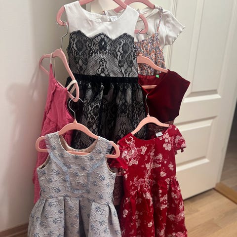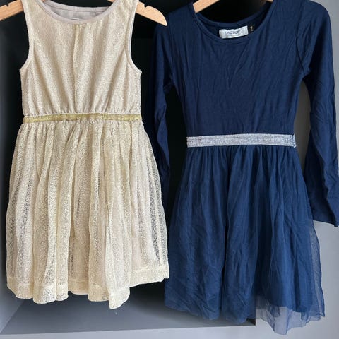 Penkjoler selges kr 150 per stk eller 400 samlet. Rosa kjole fra hm, blå kjole fra lindex, sølv/ hvit fra kapp ahl, grå med paljetter fra lindex