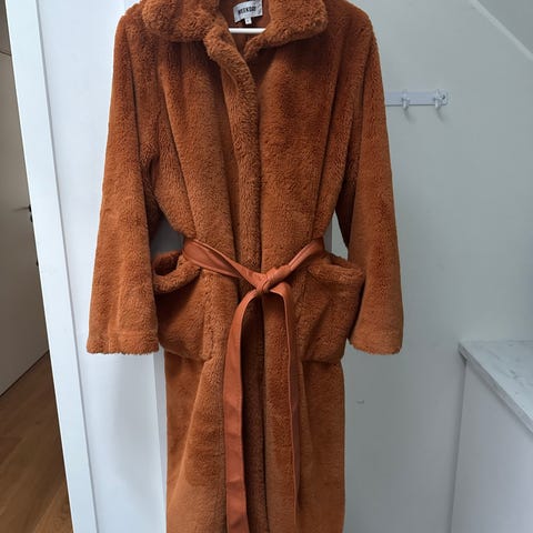 Den er laget i et mykt teddy-materiale som holder godt på varmen, og den dype rødfargen gir et stilrent og «premium» preg. Lengden er knelang og gjør kåpen både elegant og praktisk