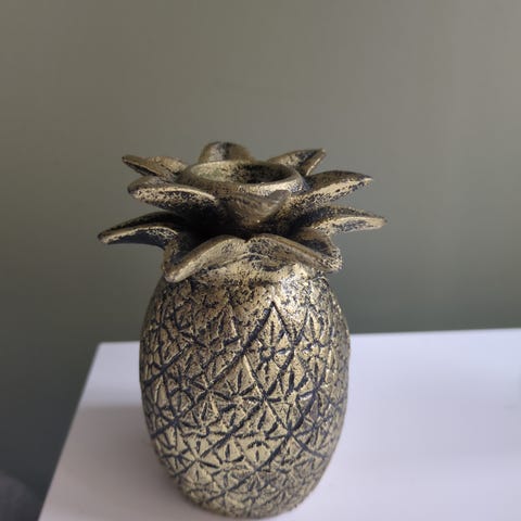 dekorasjonsfigur formet som en ananas. Figuren er laget i metall med sort trådkule som kropp og blanke gullfargede blader på toppen. Nederst er det en rund sokkel. Egner seg som borddekor eller pyntegjenstand i stue, gang eller andre rom i hjemmet.