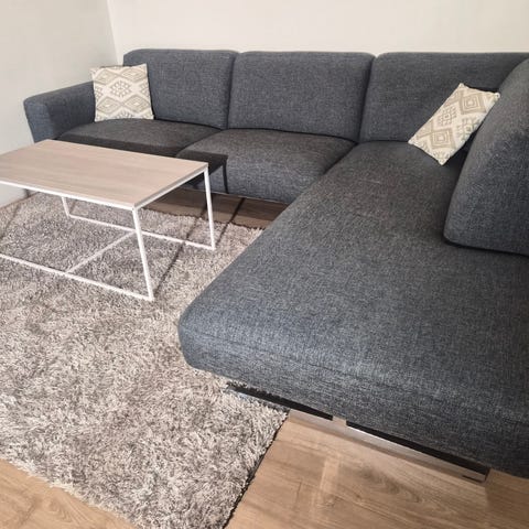 Sofa, salongbord, lenestol med puff og teppe selges samlet