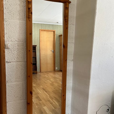 Gulvstående speil med pen treramme.