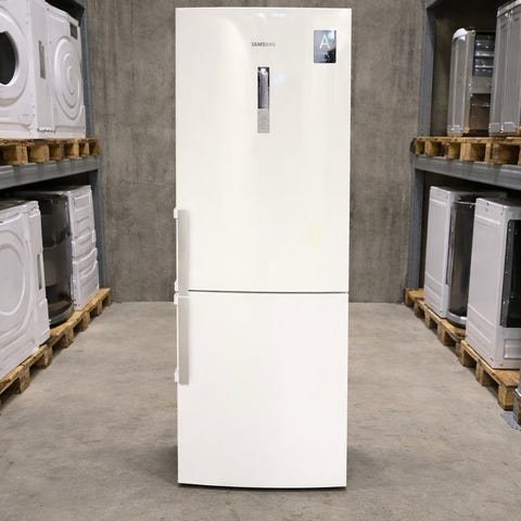Samsung Bespoke kombiskap i hvit utførelse. Kjøledelen har flere glasshyller, dørhyller og grønnsaksskuffer, inkludert Optimal Fresh+ og Humidity Fresh+ skuffer for tilpasset temperatur og fuktighet. Frysedelen nederst har tre gjennomsiktige skuffer for oversiktlig oppbevaring. Innvendig LED-belysning gir godt lys i skapet.